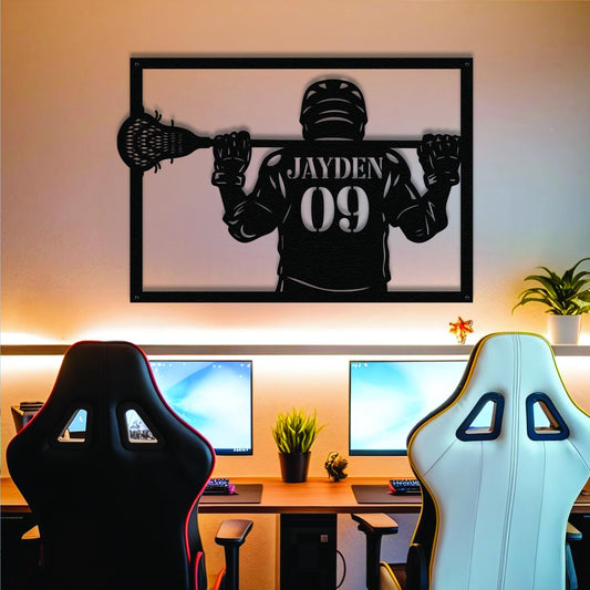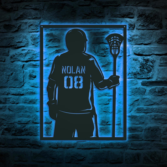 Lacrosse Player LED Metal Wall Art - Custom Name Sign with Jersey Number, Personalized Sports Room Decor, Gift for Lacrosse Enthusiasts
